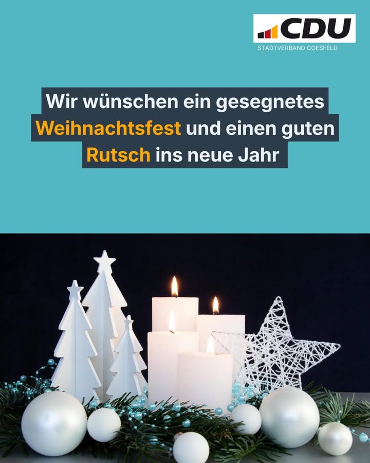 ✨ Ein bewegtes Jahr liegt hinter uns. ✨In diesen Tagen nehmen wir uns bewusst Zeit, zurückzublicken ? auf viele intensive Momente, einen spannenden Wahlkampf und vor allem auf die zahlreichen wunderbaren Begegnungen und Gespräche mit euch.Dafür sind wir von Herzen dankbar. Dankbar für das Vertrauen, den Austausch und die Unterstützung aller Bürgerinnen und Bürger sowie unserer Mitglieder. 🤍Nun wünschen wir euch und euren Familien frohe und gesegnete Weihnachten, erholsame Tage und einen guten Start ins neue Jahr. 🎄✨Mit Zuversicht, Freude und neuen Ideen blicken wir nach vorn ? und freuen uns auf alles, was das kommende Jahr für uns bereithält.Danke, dass ihr Teil dieses Weges seid. 🌟#cducoesfeld #coesfeldkannmehr #weihnachten #dankbarkeit❤️